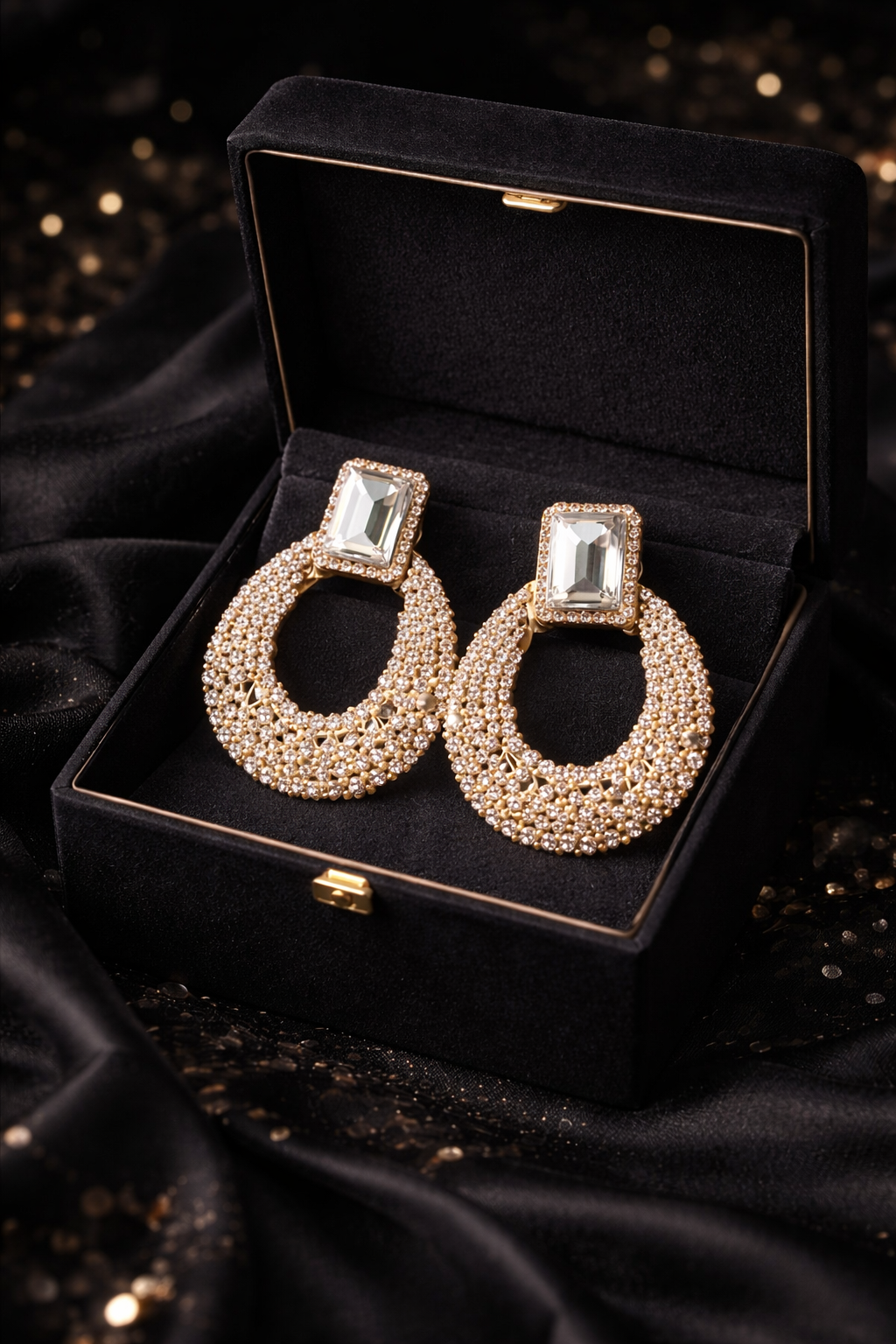 Glamorous gold-tone hoop earrings embellished with shimmering crystals and topped with a bold rectangular stone. Perfect for adding sparkle to evening looks, weddings, and festive occasions.
