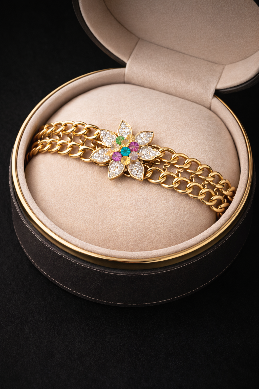Add a touch of elegance to your wrist with this beautifully crafted floral charm bracelet. Designed with a rich gold-tone chain, it features a stunning flower centerpiece adorned with sparkling stones and vibrant multicolor accents that catch the light from every angle.