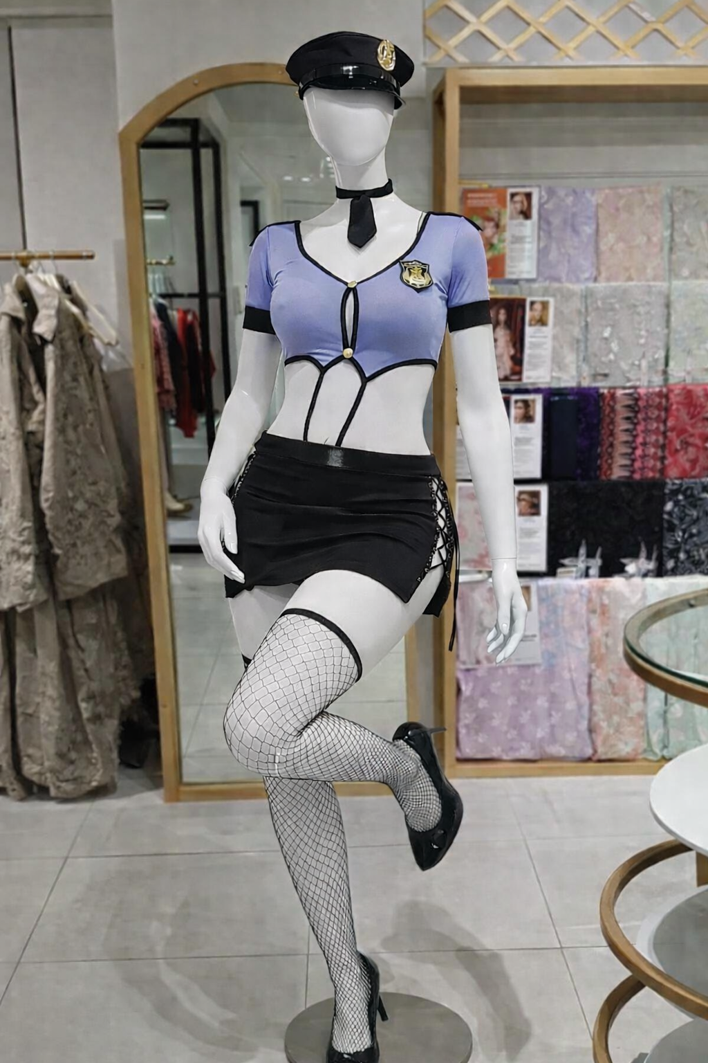 Turn up the confidence with this bold and stylish Midnight Police Chic Set. Designed with a modern twist, this outfit features a fitted crop top with edgy cut-out details, paired with a sleek mini skirt that enhances your silhouette. The addition of fishnet stockings and statement accessories brings a daring yet fashionable vibe to the look.